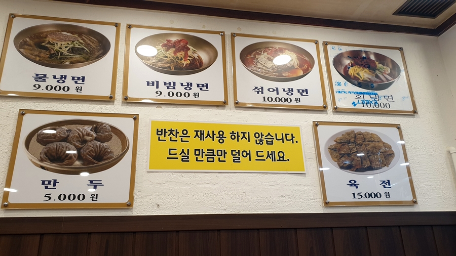 진주황포냉면 메뉴는 물냉면 9천원 / 비빔냉면 9천원 / 섞어냉면 1만원 / 육전 1만5천원이다.