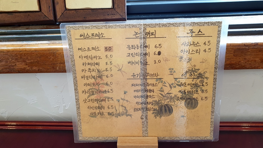 커피는 5.5에서 6.0원으로 쪼금 다른 곳보다 비싼편이다. 문화동라떼라는 것이 있던데, 카운터에 가보니 메뉴판이 다르다. 문화동라떼가 밀크티였다.