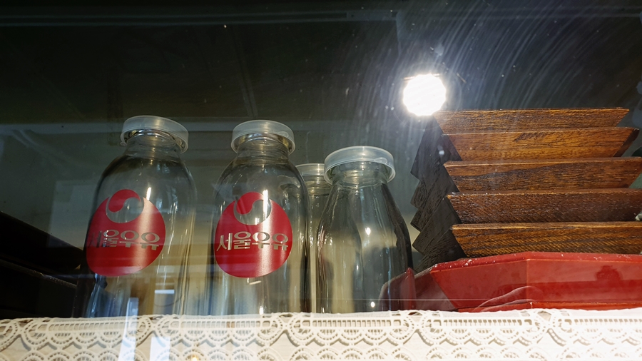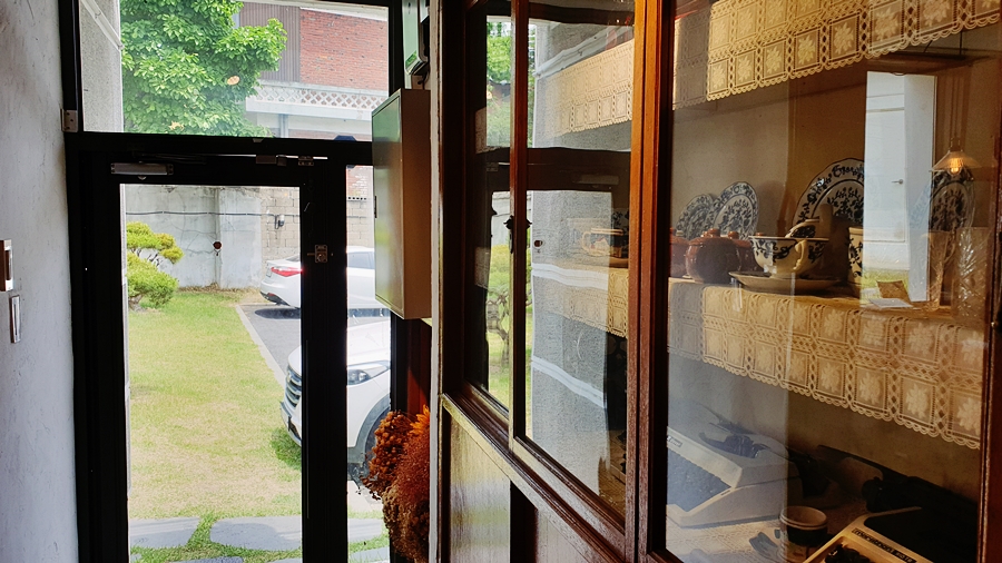 현관문을 들어서 왼쪽에는 오래된 나무 장식장이 있는데, 그속에는 옛날 우유병, 찻잔, 타자기 등이 진열되어 있다. 풍물시장의 가게를 보는 것 같다.