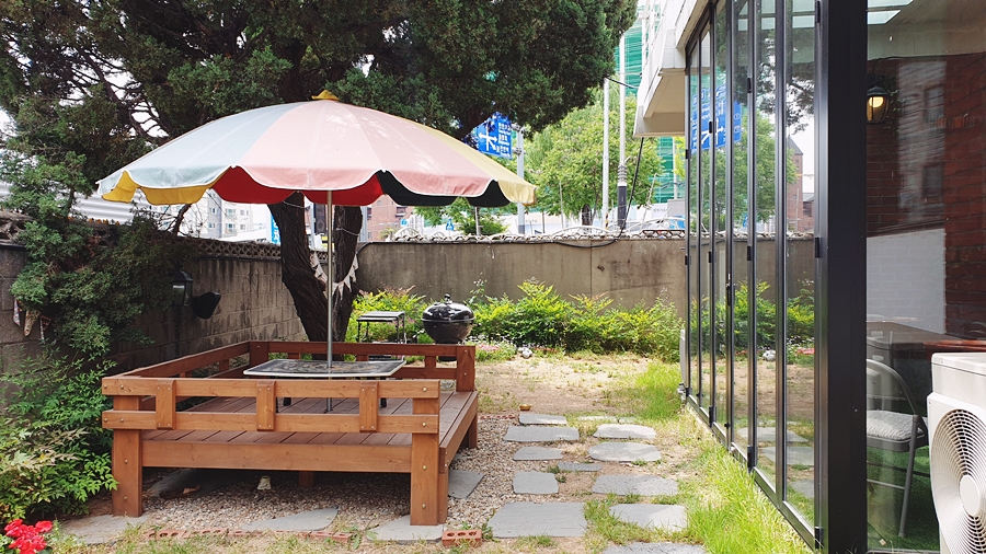 뒤에서 볼때는 흰색만 보였는데, 앞으로 오니 빨간벽돌이 보인다. 왼쪽으로는 평상이 있고, 평상에는 바베큐 장비도 보인다. 파티도 하나보다.
