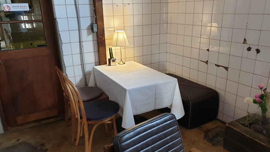 카페에 들어서니, 개성이 넘친다. 오랜 벽과 타일은 살려두고, 최소한의 개조로 집 자체의 분위기를 남겨 두었다.