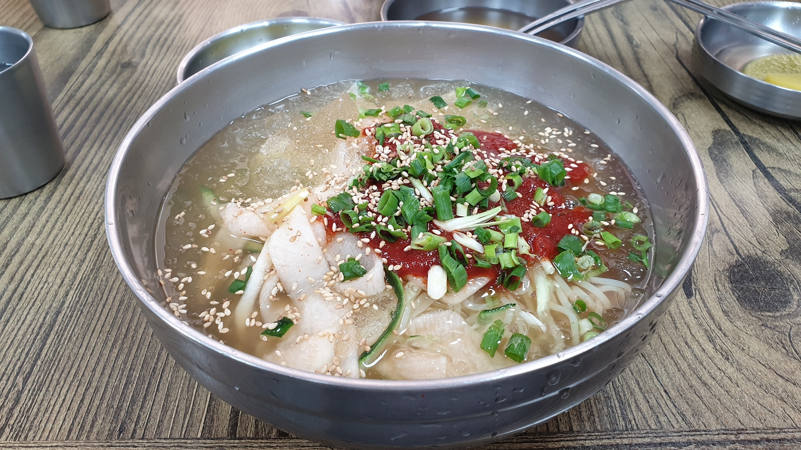 냉면이나 물막국수처럼 살얼음 동동 띄운 육수가 담겨져있는 냉쫄면. 국물에 빠져있는 쫄면은 처음이라 생소한 비주얼이다.