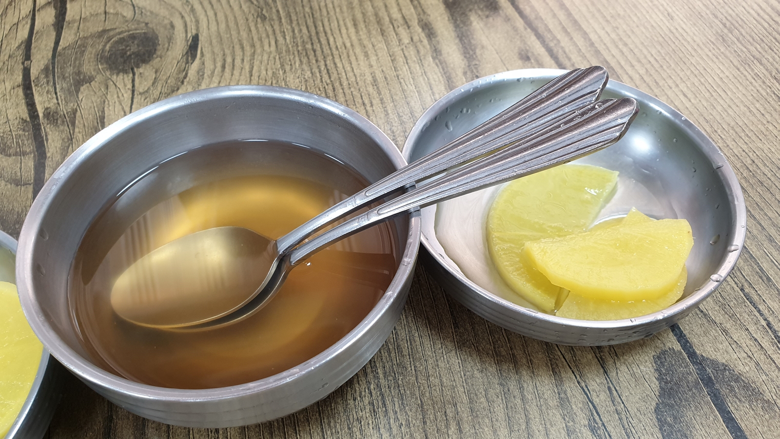 기본으로 나오는 국물과 단무지.