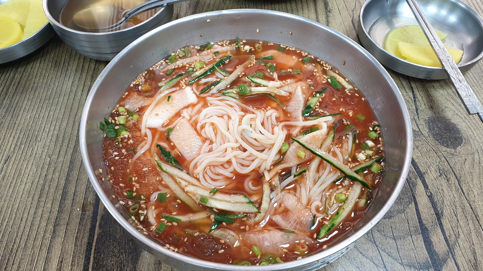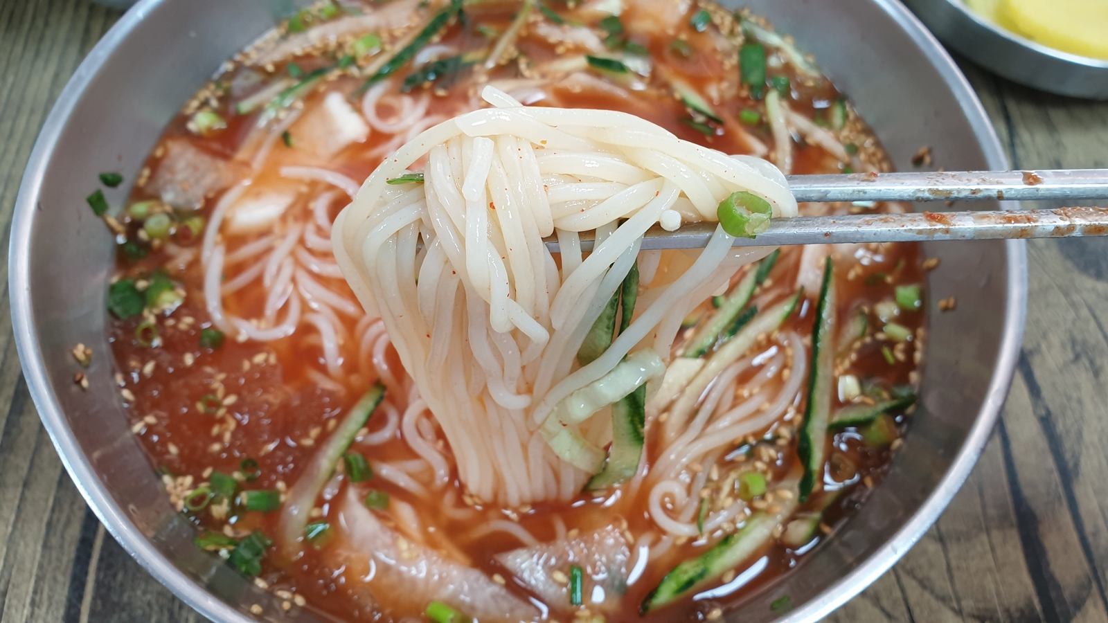 위에 올려진 고명과 양념장, 그리고 면을 섞어주었더니 붉은색으로 변하면서 좀 더 맛깔스러운 색을 풍긴다.