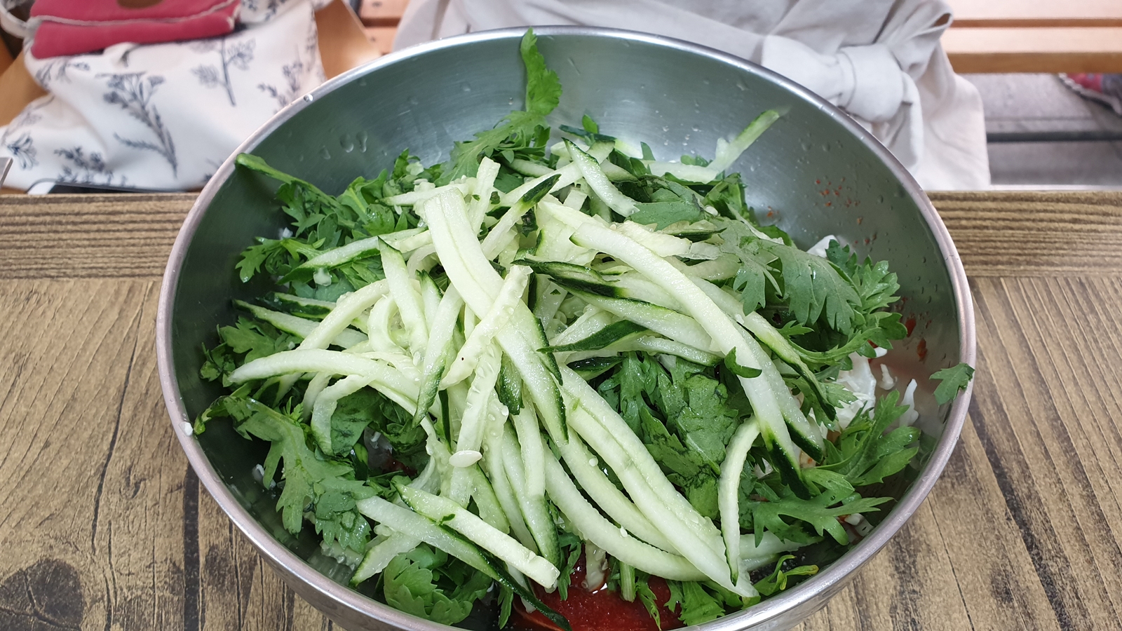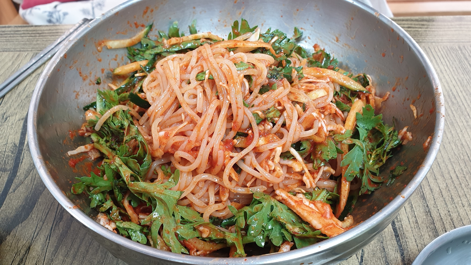 비빔쫄면. 보통 생각하는 그 쫄면이 맞다. 단지 쫄면 위에 올려진(수북이 쌓인) 오이채와 쑥갓의 조합이 신기하다. 보통은 콩나물, 오이, 상추, 당근 등등 채 썬 채소들이 등장하는데 경주명동쫄면은 오이채와 쑥갓이 듬뿍 올려져 있다.