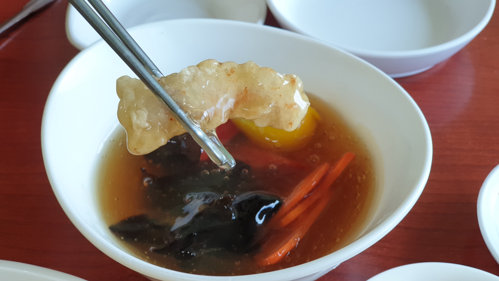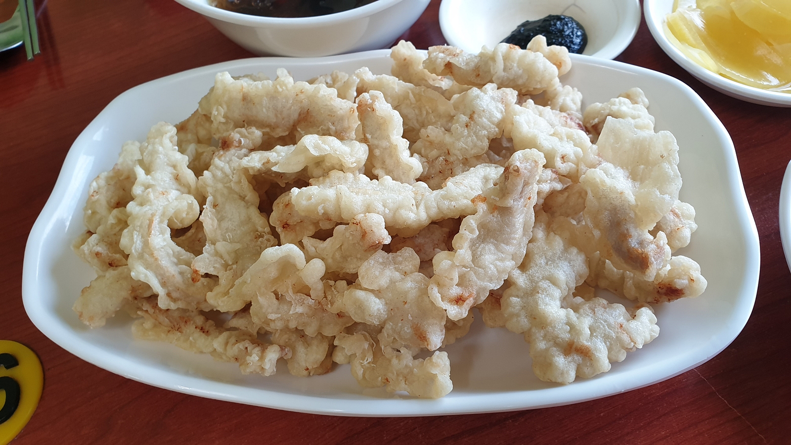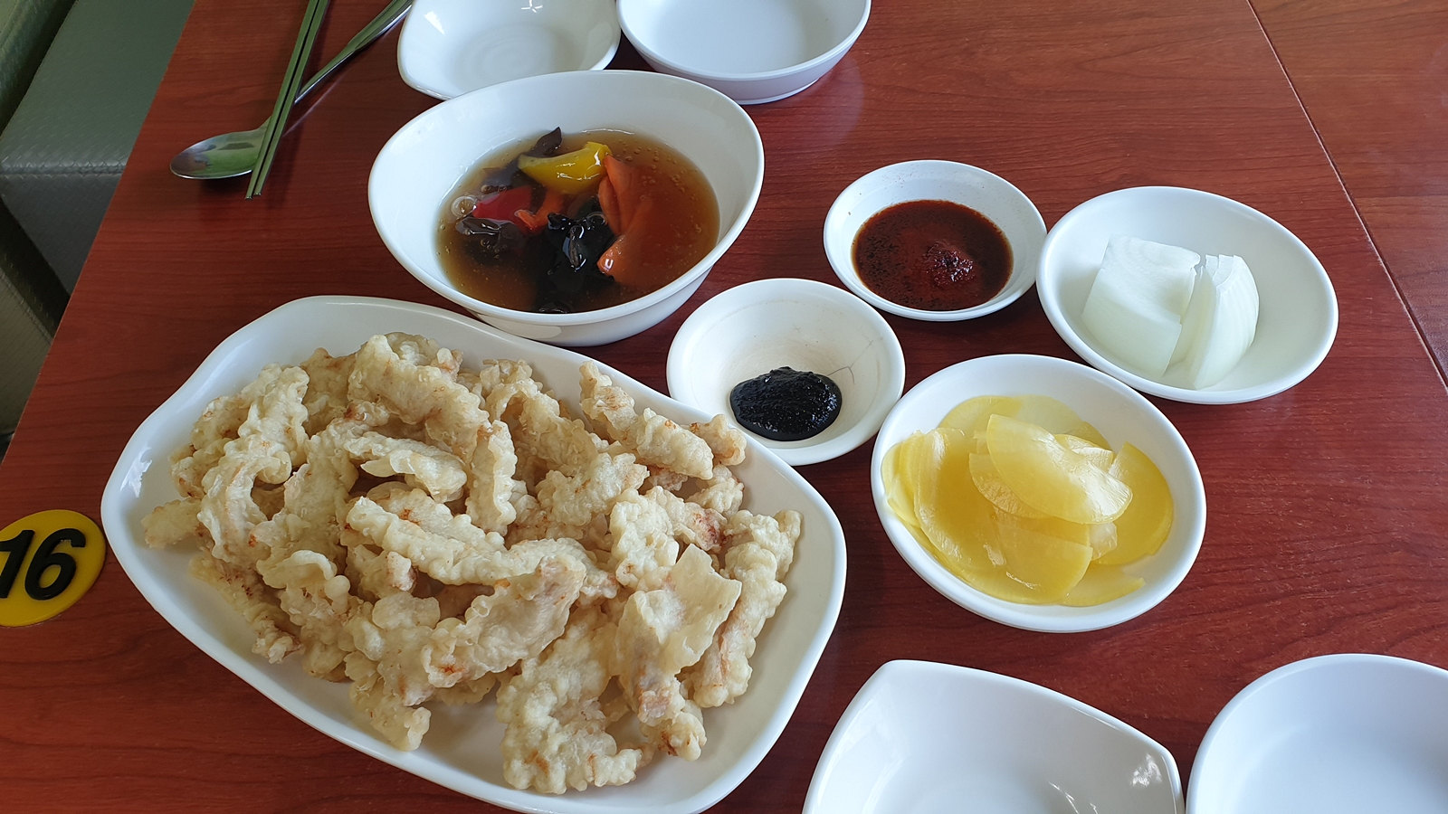 새콤달콤한 소스에 찍어 먹어보는데 돼지고기도 부드럽고 튀김도 바삭한게 맛있었다. 특히 탕수육 튀김은 딱딱하거나 찹쌀반죽이 아니라 마치 오징어튀김같은 느낌의 튀김옷이라고나 할까?
