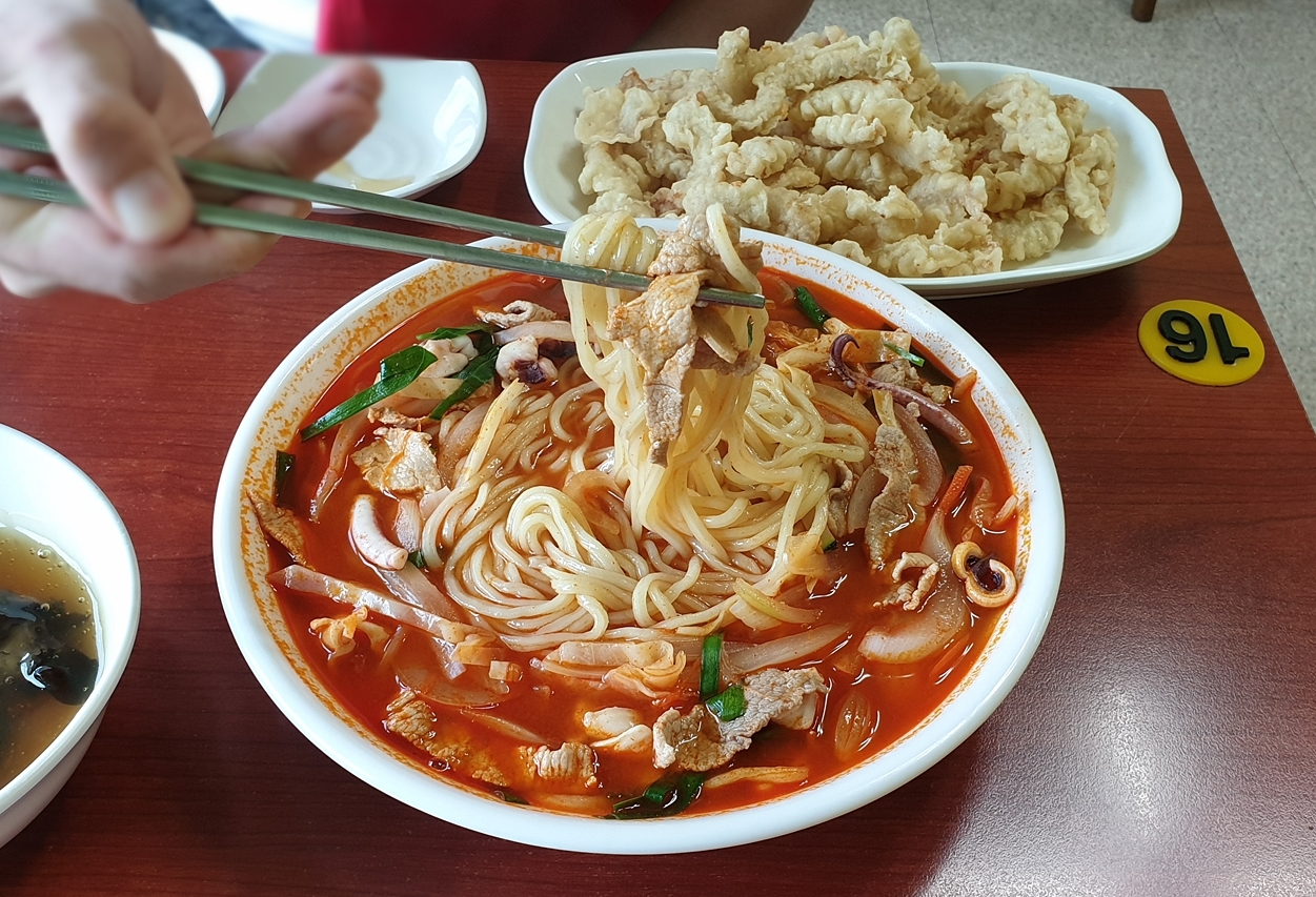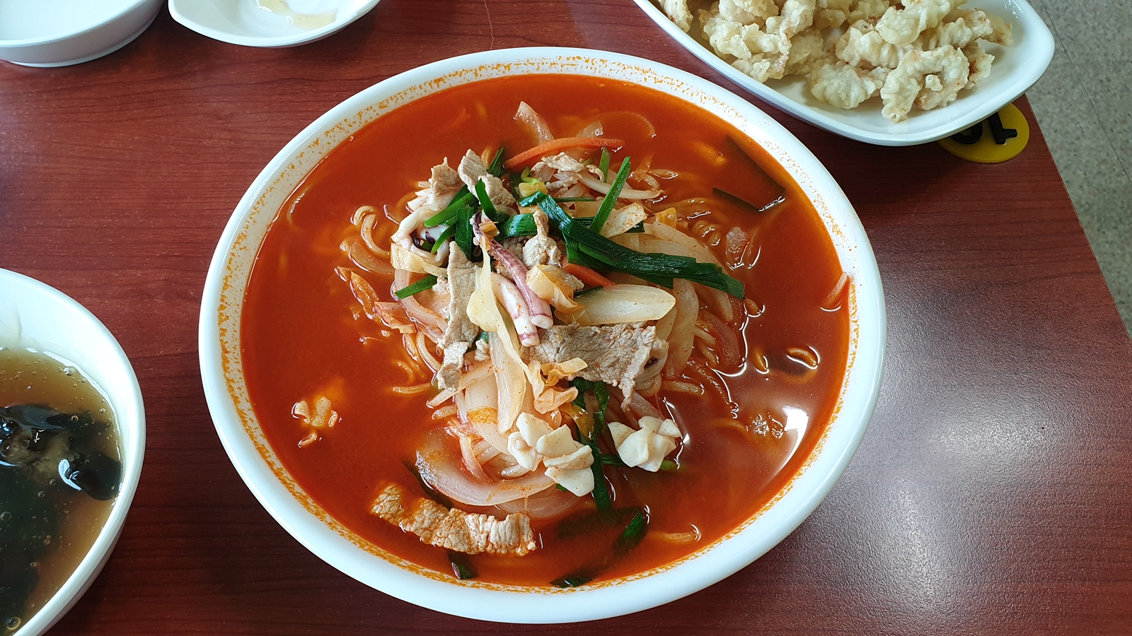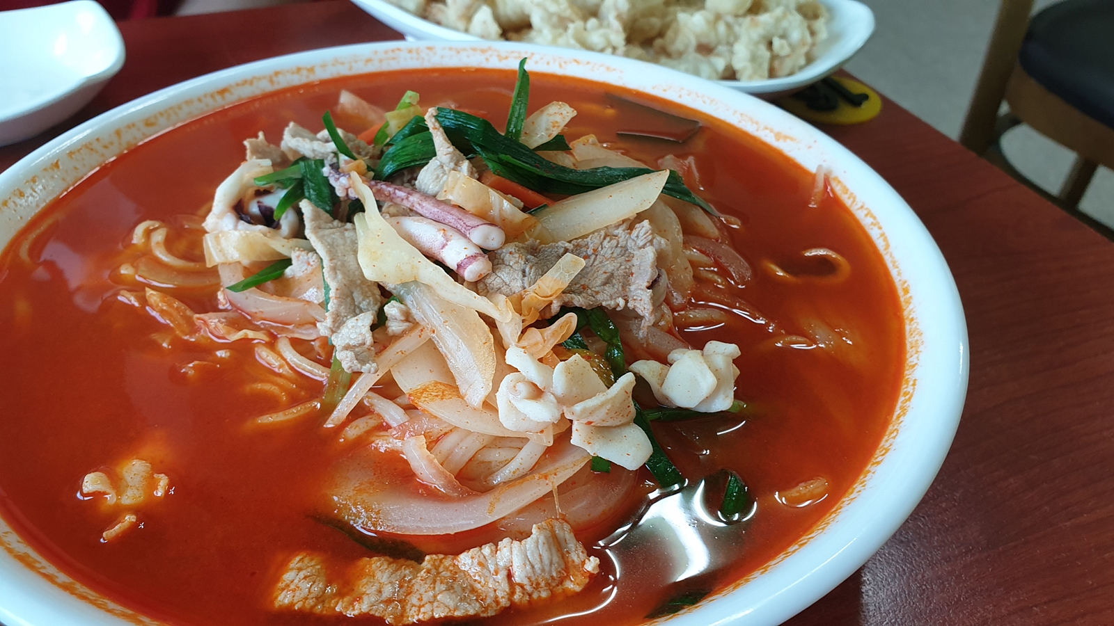 일단 눈으로 보기에도 푸짐해보이는 양에(곱배기라 당연한건가?? ㅎㅎㅎ) 오징어와 고기, 야채들이 한껏 올려져있었다. 국물은 딱 보기에도 불맛나는 진하고 걸쭉한 스타일이 아닌 깔끔하고 개운한 스타일의 국물같아 보였다.