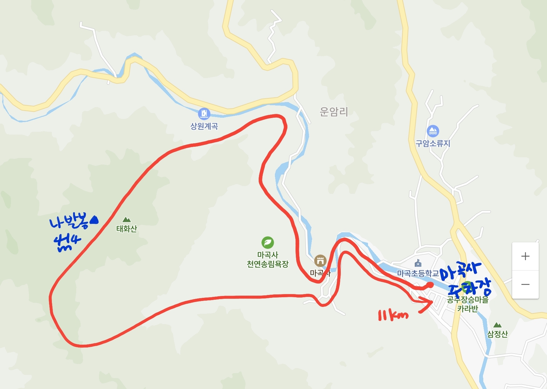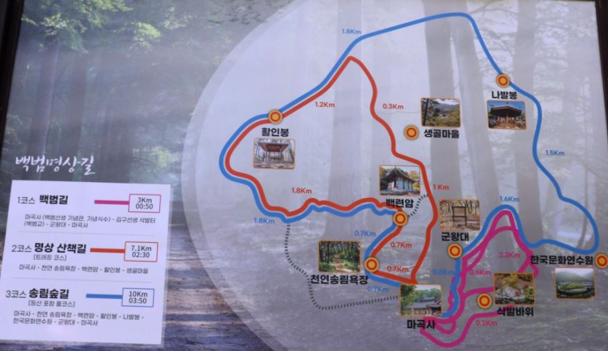 6) 경로 : 마곡사 주차장 → 마곡사 → 솔바람길 → 한국문화연수원 → 나발봉 → 생골마을 → 마곡사 → 마곡사주차장