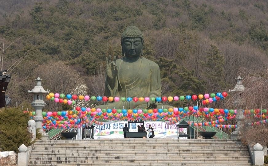 현재 이곳에는 대웅전(大雄殿), 설법전, 관음전(觀音殿) 등의 건물이 들어서 있다. 높이 12m, 둘레 30m, 무게 60t에 이르는 거대한 청동아미타불상과, 엄청난 규모의 태양의 성종이 특히 유명하다. 또한 1996년 10월 15일에 낙성된 대웅전은 목조 건물로는 국내 최대 규모이다.