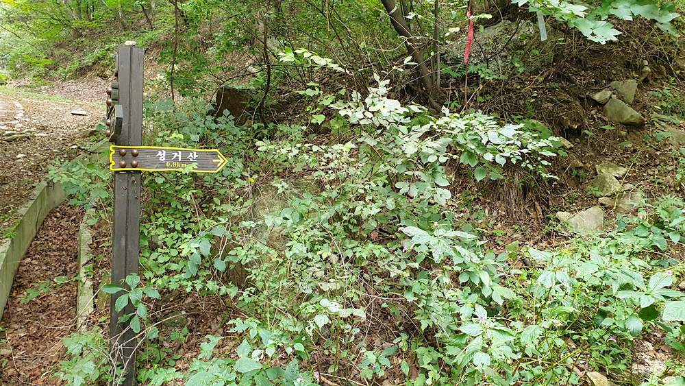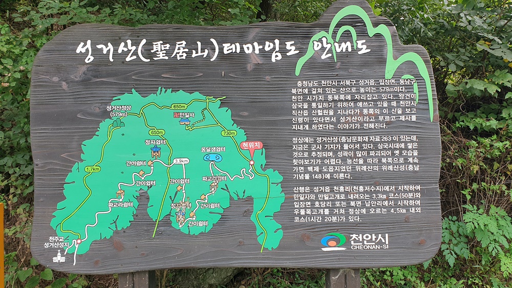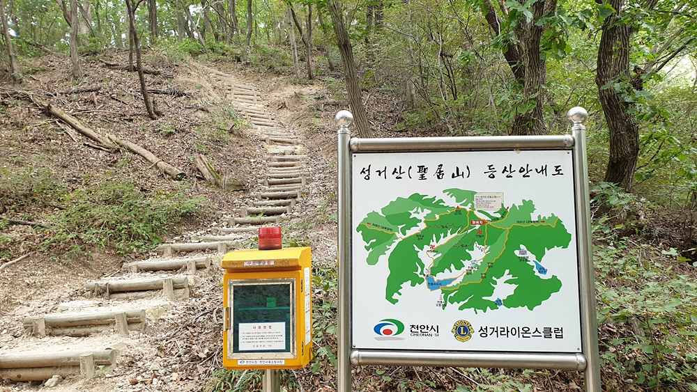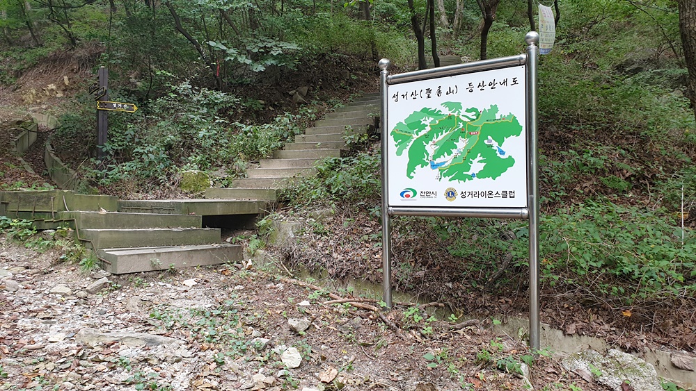 천흥저수지에서 만일사 방향으로 오르다 만일사에 도착하기 바로 전 오른쪽으로 성거산 정상으로 향하는 등산로가 나온다.