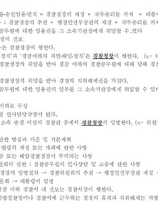 2. 경찰조직법1) 경찰조직법a. 경찰조직에 관한 기본법b. 경찰의 존립근거에 관한 근거를 부여하는 법c. 경찰법이 제정되기 이전에 우리 경찰의 근거법은 정부조직법이다.2) 경찰기관의 종류a. 경찰행정관청, 경찰의결기관, 경찰자문기관, 경찰보조기관, 경찰집행기관 등b. 경찰행정관청 : 경찰청장, 지방경찰청장, 경찰서장 등이 해당한다. (x- 지구대장)c. 치안행정협의회 : 경찰자문기관d. 경찰위원회 : 심의․의결 기관e. 경찰집행기관 : 치안총감, 치안정감, 치안감, 경무관, 총경, 경정, 경감, 경위, 경사, 경장, 순경 등에 해당한다.f. 경찰청의 차장이나 과장은 보조기관이다.3) 경찰청장a. 경찰청장은 치안총감으로 보한다.b. 국가경찰에 관한 사무를 통할하고 청내 사무를 관장한다.c. 임기는 2년,..