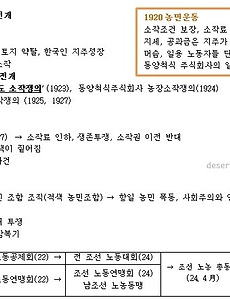 * 조선 공산당 (1925)1. 화요회 (김재봉, 김찬), 북풍회 (김약수, 정운해), 상해파 (주종건)2. 과정1차 - 김재봉 (이르쿠츠파, 1925) - 코민테른에서 파견, 북풍회, 화요회 중심➝ 박헌영의 공산당 내 고려공산 청년회 (화요회 중심) 조직“조선의 완전 독립” 신의주 변호사사건으로 해체 (박헌영의 비밀문서) - 1925. 11. 2차 (1925) - 강달영 ‘국민당’결성 (조선일보)1) 코민테른은 서울청년회, 화요회 동시 인정 2) 6•10만세 운동 주도3) 순종 인산일 격무으로 해체3차 (1926) - 김철수, ML당, 안광청, 신간회 결성 등에 참여 4차 (1928) - 차금봉, 반제국주의 혁명노선3. 사건1) 12월 테제(1928) “공산당 조직의 어려움은 일제의 탄압에 의한 객관적..