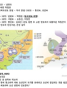 4. 독립군의 재정비(1) 대한 통의부 (1922) - 남만주1) 서로군정서 + 대한 독립단2) 공화주의 vs 복벽주의로 분열 - 다시 분열 (1923) - 통의부, 의금부(2) 3부의 조직 1) 참의부 (1923 ~ 1927) 입법부 - 백광운 (임시정부 직할)2) 정의부 (1925 ~ 1927) 사법부 - 오동진, 지청천3) 신민부 (1925 ~ 1927) 행정부- 김좌진 (간도 참변 후 소련 영토에서 되돌아온 독립군이 조직)4) 성격 – 각부에 민주적 민정기관, 군정 설치5. 미쓰야 협정 (삼실협정, 1925)(1) 독립군 체포시 보상금(2) 만주 군벌 장쭤린 과 총독부 미쓰야 “중국 관헌은 각 현에 통고하여 재류 조선인이 무기를 휴대하고 조선에 침입하는 것을 엄금한다.이를 어긴 자는 체포하여 조선..